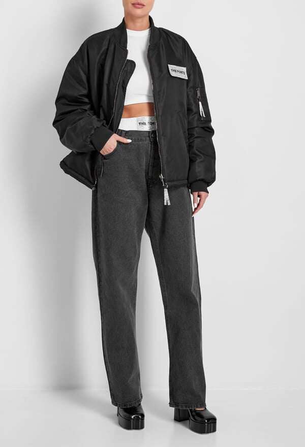 Черни дънки, тип “baggy” с ефектна емблема с камъни на задния джоб. Дънките са уголемени. Made in Italy