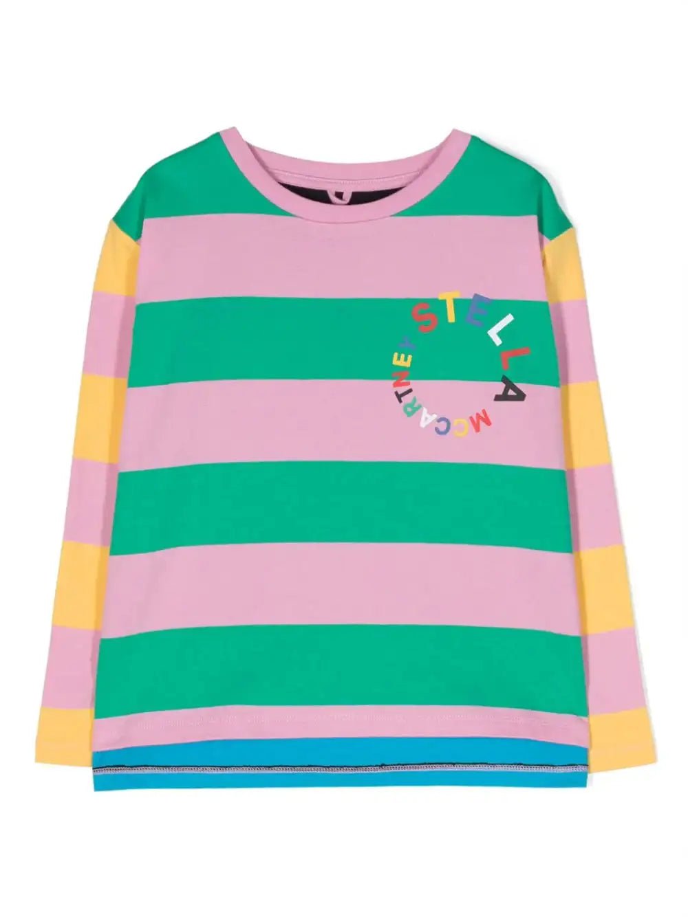 Ефирна блуза с дълъг ръкав, многоцветно райе. Отпред в зелен и розов цвят, отзад в черен и син цвтят. Цветно логом кръг в горната част на модела.