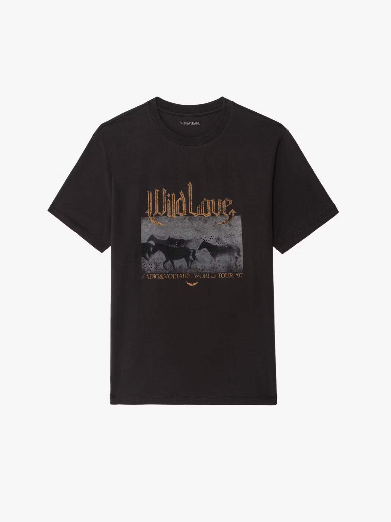 Кафява тениска, апликация с коне, надписи и блестящи цветни камъни. Надписи на гърба.