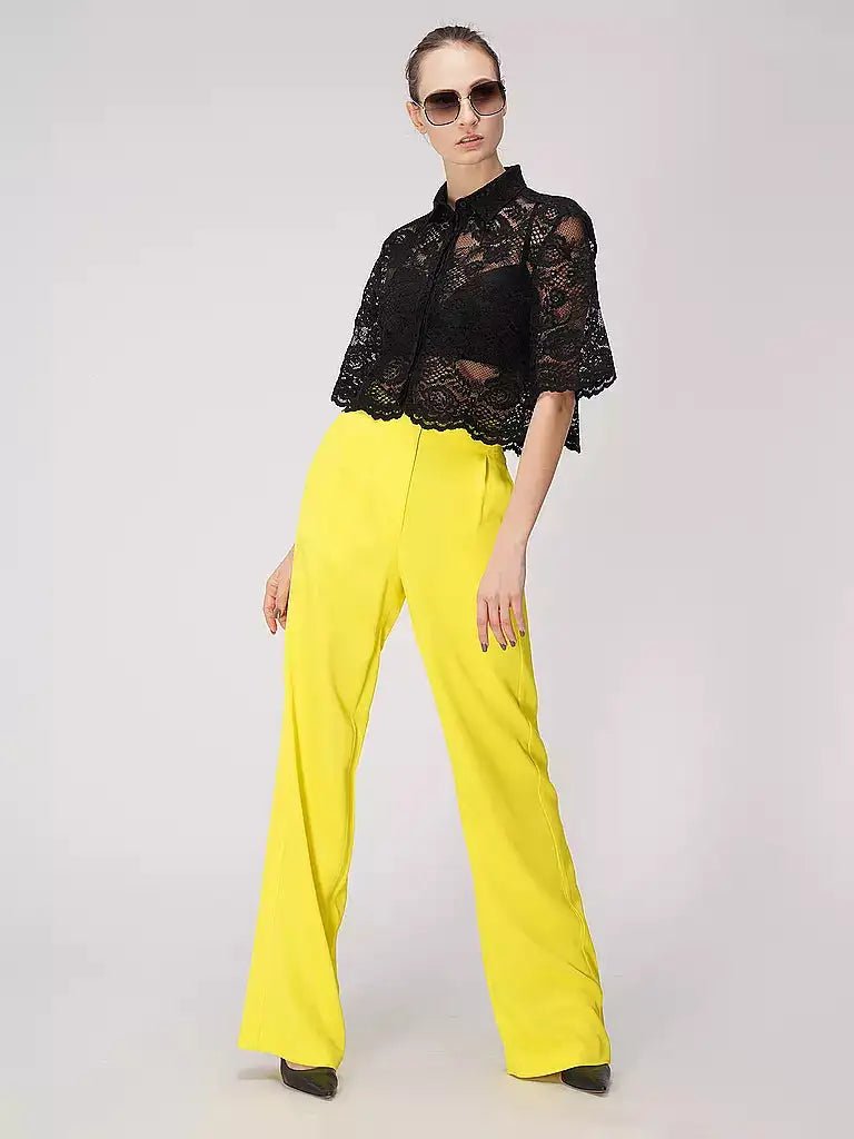 Жълт спортно-елегантен дълъг панталон. Прав, широк силует. Бяла лента отстрани, която визуално издължава силуета. Черни контрастиращи ленти отзад.