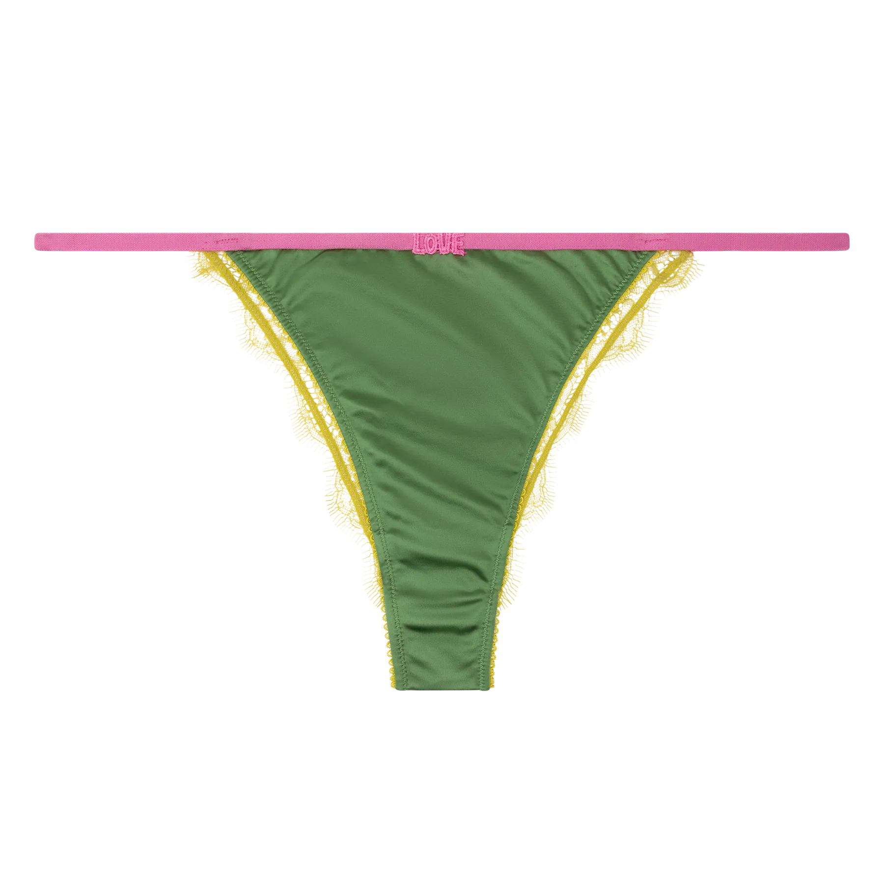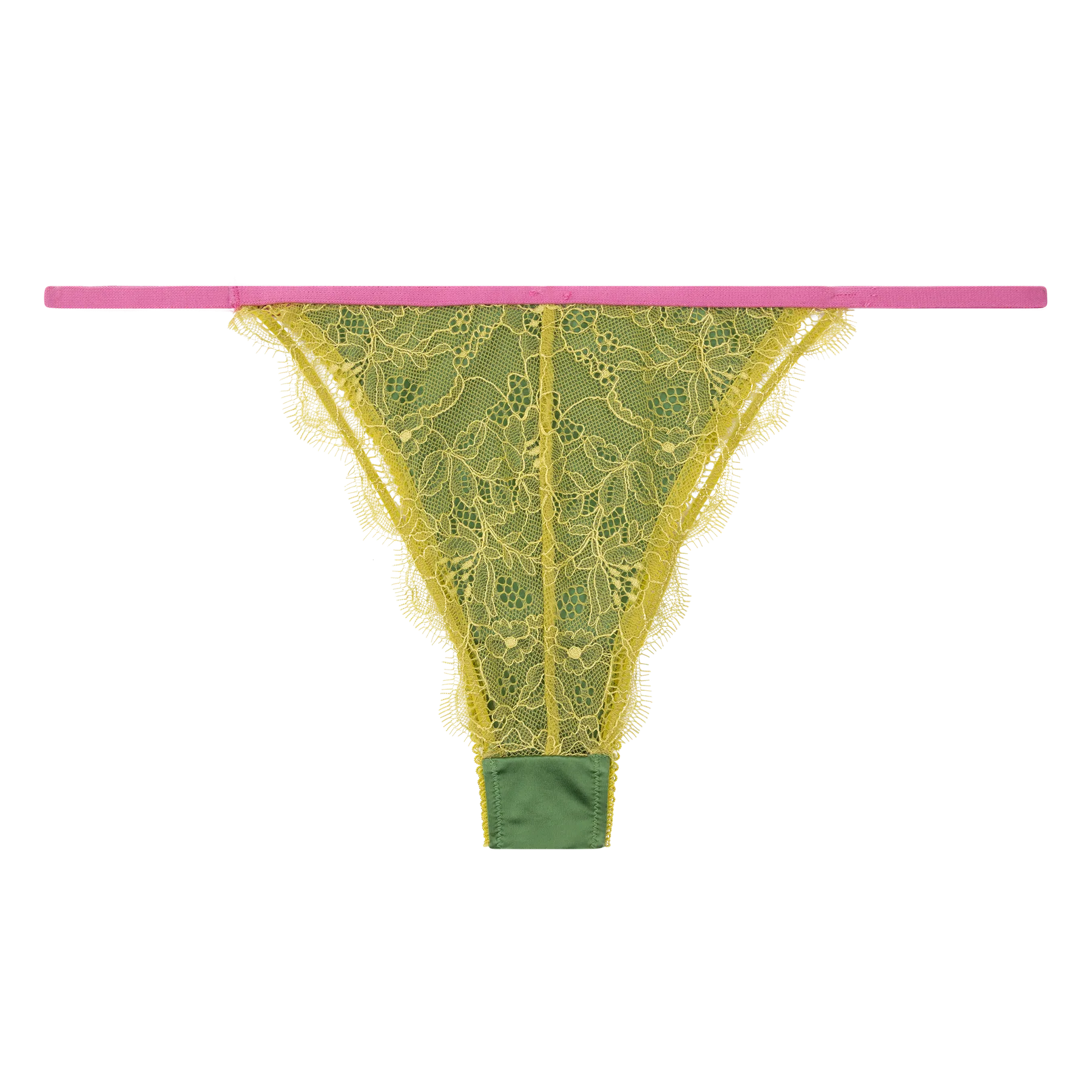 Зелени бикини, жълта дантела отзад. Розов ластик на талията за допълнителен комфорт.