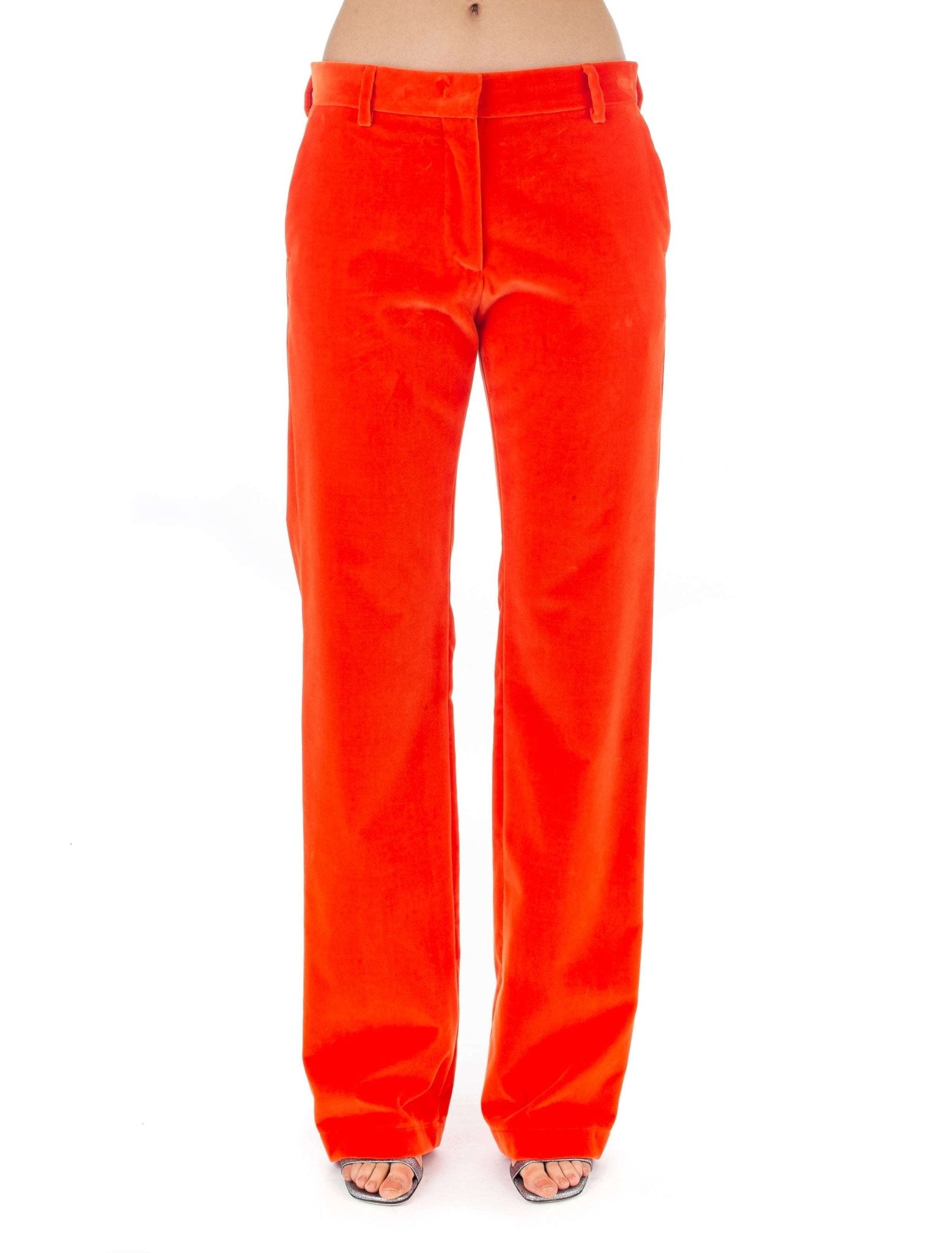 Ефектен панталон в червен цвят, кадифена материя. Втален модел с разширение в долната част. Гайки за възможност на носене с колан.