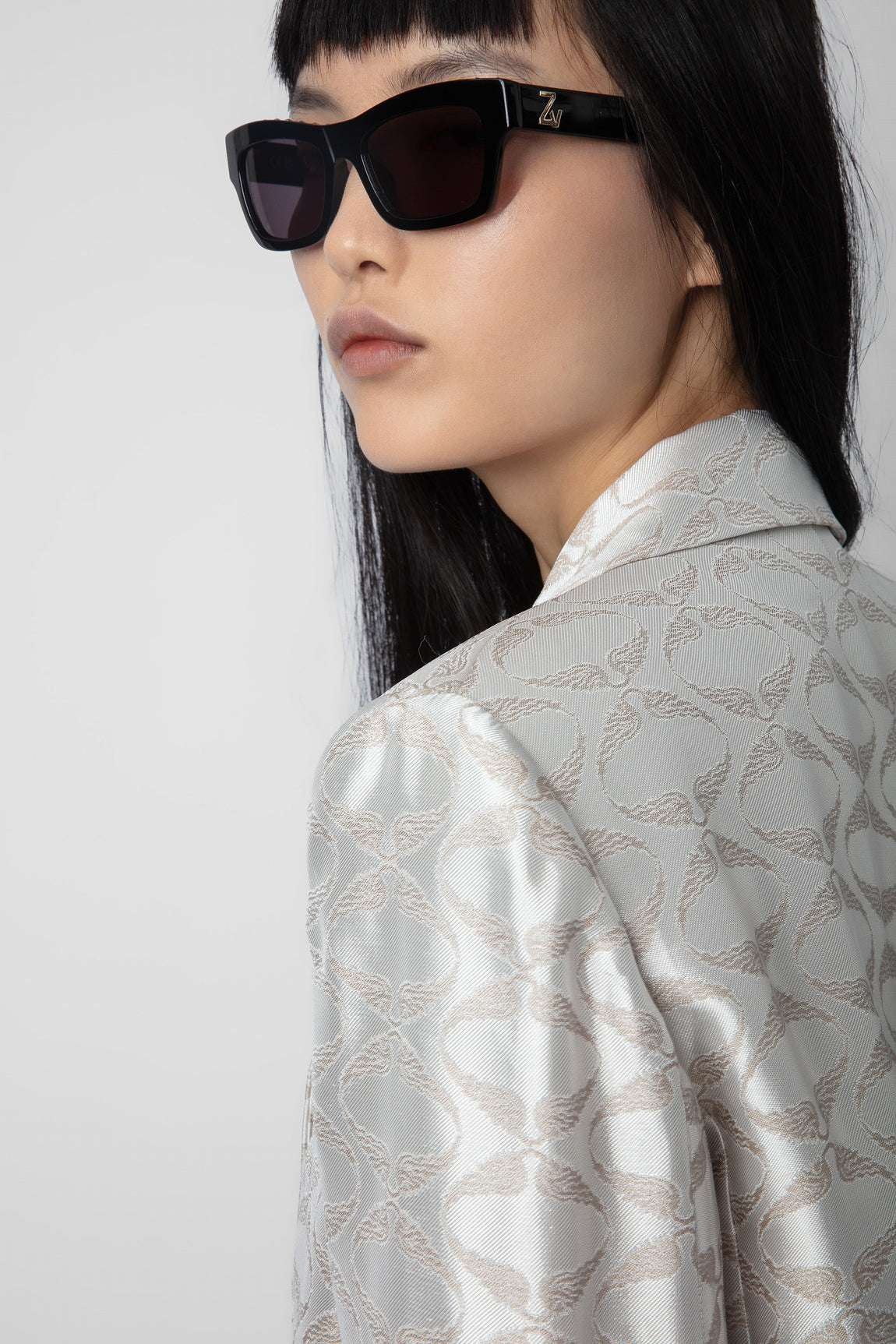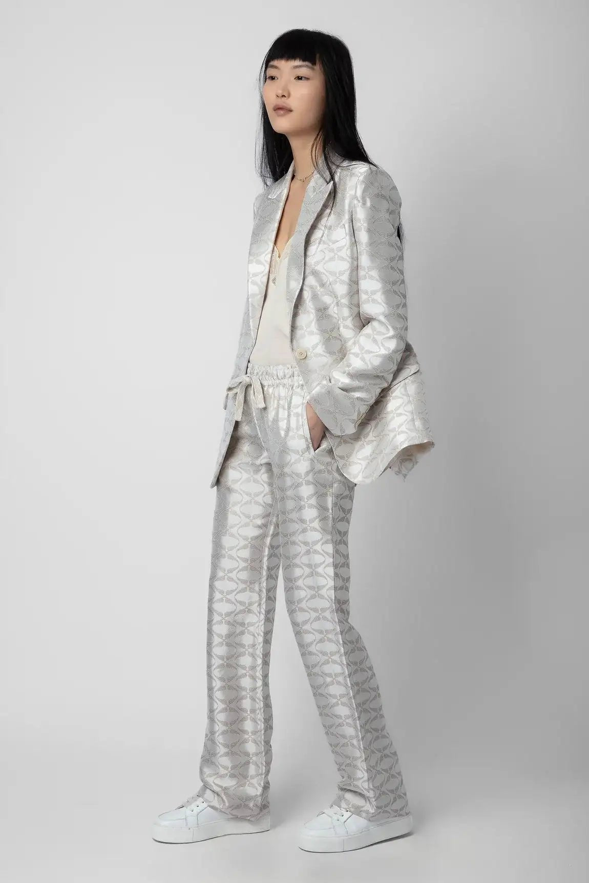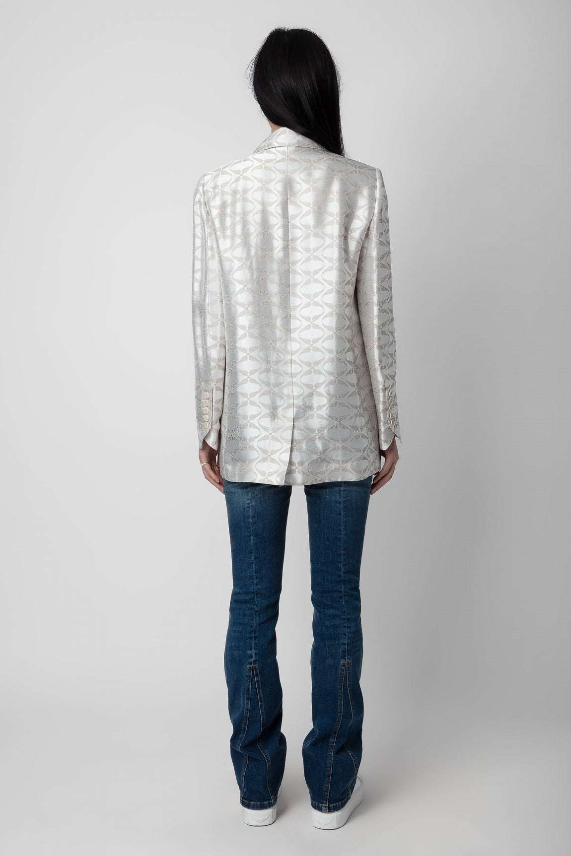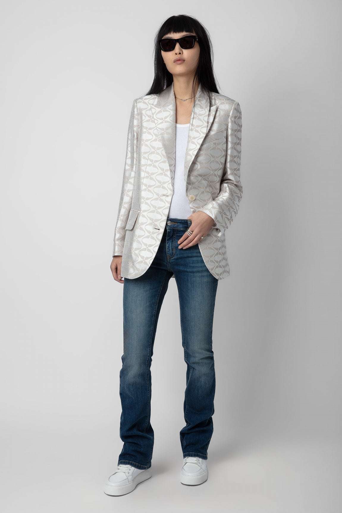 Елегантно сако в сребрист цвят, права кройка с ревер и джобове отпред. Моделът е леко удължен. Закопчава се с копчета по средата. Принт от криле по целия модел. Задължителна дреха за всеки дамски гардероб.
