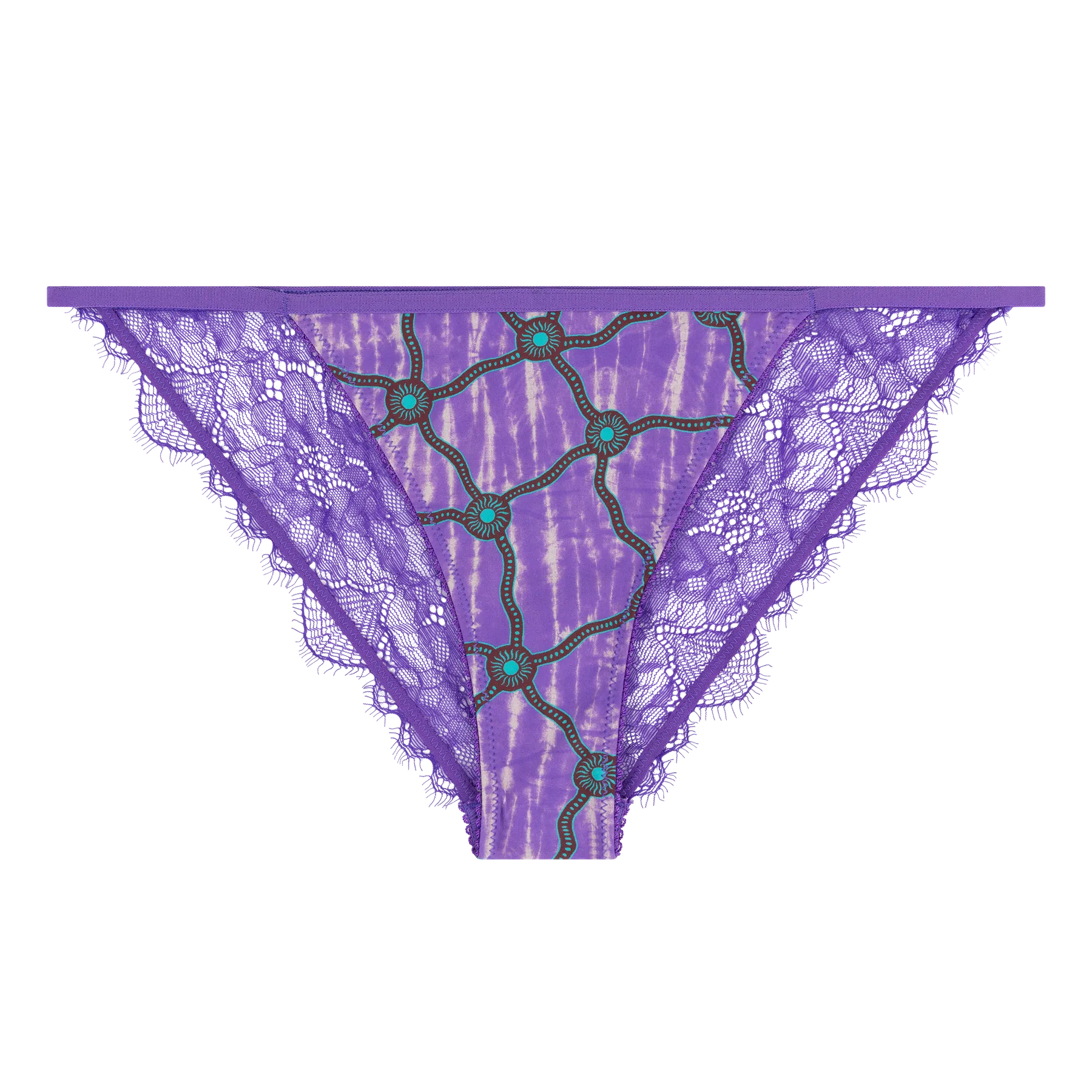 Лилави бикини с цветен принт. Лилава дантела отзад.