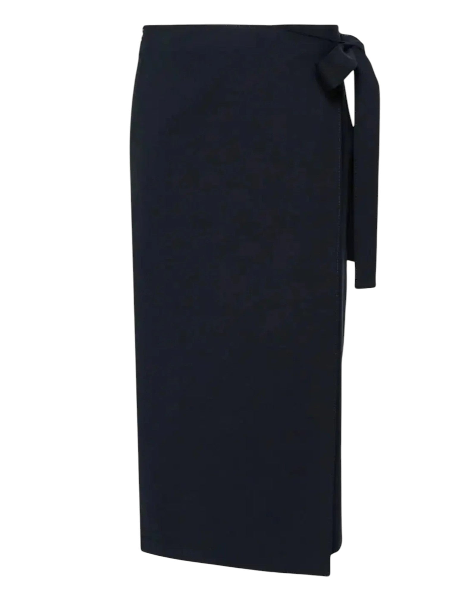 Тъмносиня дълга, асиметрична пола с ефирна връзка отстрани.